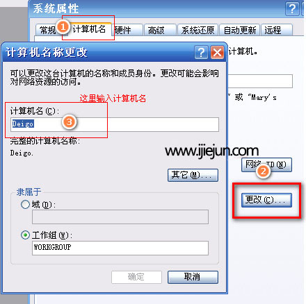 操作方法是: 我的電腦,右鍵,屬性,計算機名,更改,改完后需要重啟電腦。