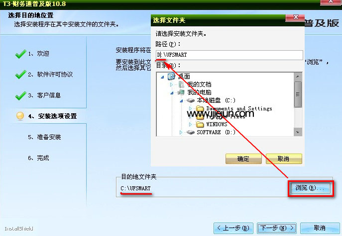 我們單擊“目的地文件夾”右邊的“瀏覽”把安裝路徑其中的C改成D就可以了。D:UFSMART
