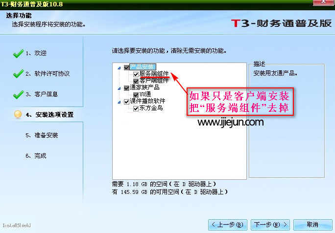 如果只是客戶端安裝要把“服務端組件”去掉,另外如果是T3用友通客戶端安裝,不需要安裝數據庫。